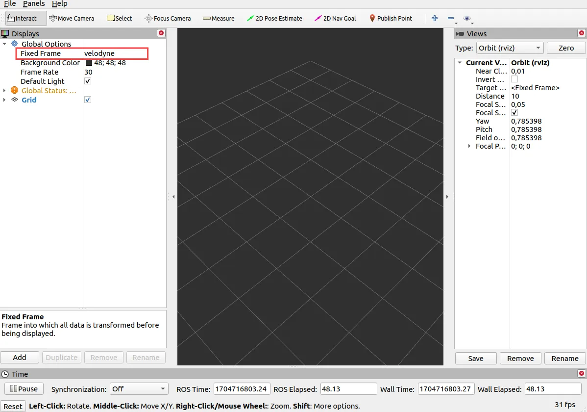 In Global Options change Fixed Frame to velodyne.